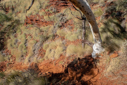 Going in with an open mind and completely forgetting what Donovan had said about the hike when he visited (I do this on purpose), I was excited to find out why this was graded as a Class 5 hike. Before starting the real hike though we ventured off towards the lookout to take some photos and also scope out what the gorge floor looked like from above. We only stayed a short while as it was a little busy at the lookout and we wanted to get stuck into exploring the gorge while the crowds were distracted here by the awesome views. Heading back towards the car park and then onto the trail towards the descent into the gorge we were greeted with some great views along the cliff face with rolling spinifex hills, some impressive termite mounds and my favourite, the ghostly trunked Snappy Gums. It isn't long before you begin the descent into the gorge and the reason why this is a Class 5 hike becomes obvious. The steep rocks make for a difficult time and you soon reach a feature that had me thinking back to my climb of Toolbrunup Peak, a small scree field.