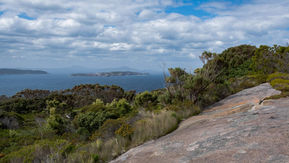 I think if this hike was all along exposed coastal scrub then it might not be as enjoyable but for me there is a joy to passing through these enclosed sections as it makes you feel like you're going through another level, escaping further away from civilisation into a different world. That illusion was broken slightly when I passed another couple heading the other way and they had an air of familiarity to them. It would be confirmed later that night after seeing their stories on Instagram and exchanging a few messages along the lines of "I thought that was you". It was a couple I follow on the socials that would usually be traipsing around Tuscany at this time of year but thanks to the Rona travel restrictions, were out exploring WA. Popping out of the undergrowth and presented with the sight of a granite section leading up the hill was a welcome sight as I'd forgotten about this enjoyable stretch. Following the cairns, this marks the start of the amazing views looking out towards Michaelsea and Breaksea Islands, the latter home to a lighthouse that makes a great feature to photograph. Making this scene even better is the presence of Mount Gardner in the background, a dramatic addition to an already impressive landscape. This area is also home to some stunted eucalyptus trees and the combination of granite, trees, water, islands and distant mountains is a particularly powerful image as you're walking through here.