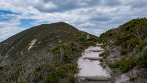 While the cloudy conditions weren't working in my favour for the wide shots, a small ray of sunshine in the distance brightened up my day. Having come here to re-shoot the trail in 2020 spec (basically lots of photos with more words to match) with my new camera, my big worry was that I'd get gloomy conditions that didn't really have any pop to them. The wide shots of the peninsula stretching out are best taken when the sun is shining and there is a bright blue sky to liven things up. Unfortunately it wasn't the day for it but I was still enjoying myself as I began the climb up towards the first of the limestone peaks that line the ridge. Erosion has become a bit of an issue on this trail as I don't think it gets a lot of maintenance love from Parks and Wildlife and climbing up the steps here you can see evidence of that. While it's nothing serious, at times you are walking in the middle of a deep-ish channel and you can see people have started walking on either side above it. This isn't great for the trail but I believe there is some money being invested here soon to upgrade the track and deal with the erosion issues. Reaching the top of this climb, I was rewarded with some really stunning views looking back towards Isthmus Hill and the bare slab of granite leading into the water. One of my favourite shots of this hike is a zoomed in photo looking towards Salmon Holes where the bare granite looks like a whale sliding back into the water.