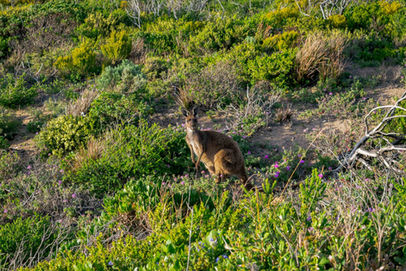 Reaching the second beach access point, this one is dog friendly now the artificial border of the national park has ended as you approach town. A set of stairs leads up from behind the dunes and takes you to a small wooden lookout that I enjoyed for a few moments, taking in the gentle lapping of the waves and admiring the various coastal formations. Heading back down the stairs, it wasn't far until the outskirts of town where the trail ends but on this short stretch I was treated to a few Blue Fairy Wrens flittering about and several kangaroos feeding on the plentiful spring grasses. Most of them were a bit curious as to what I was doing and stood there staring back at me, providing some nice photos. I reached the edge of town with a grass lane housing several dwellings, a cool old tractor and a couple of young Dragon Trees (I have two 40yo trees in my backyard that I quite like). Figuring this was a good point to turn around and not wanting to intrude on the locals, I made my way back the way I came, stopping to photograph more kangaroos that had shown up. The return leg was just as enjoyable with the sun getting lower in the sky and the light getting that beautiful afternoon glow to it. On theme for the weekend, I was joined by a trail runner for a brief period as I made my way back up the hill.