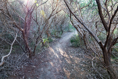 Along the edge of the brook you do hear and see a lot of birds but most of them were way too quick for me to photograph. The larger parrots were willing to play ball (i.e. just stay still for a second) and I managed to get both a Red-capped Parrot and the iconic Twenty-eight Parrot on camera. After about 500m of lovely wildflower lined trail, you climb up a set of steps and join Rushton Road for a little section. The purpose of this is to both cross Rushton Road and not have to build a separate bridge for walkers over Ellis Brook. Be mindful of vehicles along here, with the trail entering back into the forest on the other side of the road about 100m along (look for the blue poles). Back onto the single trail, this was much better, and the scenery through here is really enjoyable. The wildflower finds continued with Prickly Dryandra, Yellow Buttercups, Coach Honeypot and Two-leaf Hakea located right along the trail. Having secured Sadie's lead to my waist strap, my hands were free to photograph everything I wanted to, although Sadie sometimes had other ideas.