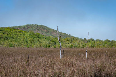 Arriving at the car park, it was a little full so we parked on the edge of the access road before gathering our gear for the walk. Having a squizz at the information board, the Lower Cascades Walk seemed like the best option but the Upper and Lower walks can be combined into a big loop if you have the time/inclination. Setting off, the first highlight is a series of side trails leading to wooden platforms overlooking the nearby swampy area. We found the last one empty of people so wandered over and looked out over the grassy plain, towards where the Upper Cascades Walk is located. Looking out for birds, insects or something bigger, we weren't lucky on this visit so continued along the trail to where it separates into the Upper and Lower paths. Passing one of the two storey toilet blocks that is the style out here, I noticed a yellow butterfly on the edge of the trail but it didn't want to open its wings for me. Taking a left turn and heading towards the Lower Cascades, the start of the trail through savanna woodland isn't the most interesting part of the walk.