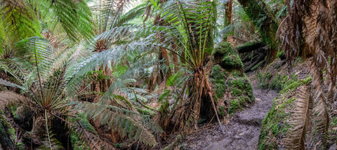 With your Julie Andrews dancing done with you can continue the hike and enter the proper rainforest all the way to Marriotts Falls. This is where it really starts to pick up in quality with large man ferns lining the trail and eventually you become fully engrossed in the loveliness of moss, ferns, fallen logs and large swamp gums. This was the Tasmania I had fallen in love with so it was nice to be back amongst it. With the trail venturing deeper into the rainforest it became muddier and muddier. Still nothing compared to Adamsons Falls although with warm weather gracing my trip so far I think this is the exception to the rule for this trail so your own experience might involve a bit more mud. Rounding each corner brought more magical scenes and I found myself stopping a lot to fully take in an array of fern fronds caught in the afternoon sun or just admiring an expanse of moss that had carpeted a decaying tree. As you can see from the pictures, this stretch is a world of a million shades of green. I was in no rush to get to the falls and really hoped this would last for a decent length of time.