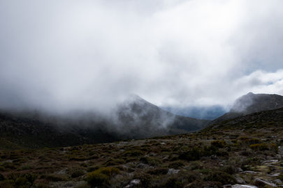This was a really magical stretch as the flatter section made it easy to pick up the pace but that was balanced out by my frequent stopping to take it all in and photograph every last detail. Passing Clemes Tarn, I had a brief look around before continuing along the path as I noticed the mist starting to disperse a bit more. I would be coming back this way so figured I could spend more time exploring this spot that I would find out is one of the wild places you can camp at up here. The best views were across the valley and back towards where I had come from and I was hoping that the winds would push that final bit of mist over the peaks by the time I arrived. What the rolling mist did do is give Naturalist Peak this powerful presence as I'd get glimpses of the craggy spires and then moments later they'd be shrouded again. Not being able to see what was ahead of me, I initially thought that Naturalist Peak was Mount Field West and every new view I got of the summit had me wondering how I was ever going to get to the top.