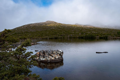Reaching the plateau, the terrain changes once again from rocky boulder fields to boggy, tarn filled alpine fields. This is where I found it most difficult as the path isn't very well defined and at times there is no option but to step on the fragile Cushion Plants that call this place home. Those that know me are aware I have a thing about people stepping on moss that grows on the granite platforms and peaks of Western Australia and I feel the same here in Tassie about the Cushion Plants. Sometimes it can't be avoided and it's clear that hikers have been as sensitive as they can be with no wide diversions to avoid muddy boots. It's something you can't avoid so don't come up here expecting to leave with dry boots. It makes for an interesting experience though as you can never tell how deep your next step will go. Will it be sole deep or ankle deep? Luckily there are some rocky sections to ease the passage and with all the mist hanging around it felt like I was in a world all to myself. Still unable to see Mount Field West I continued on and thankfully the heavens parted. Looking behind me, the now not so intimidating Naturalist Peak came into view and looked like a small hill compared to the striking views you get climbing past it.