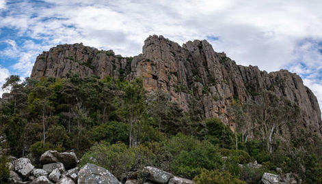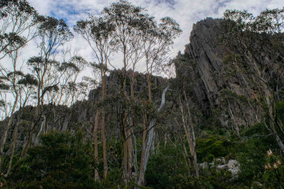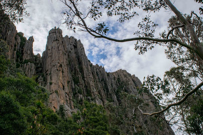 It's a good reminder that it wasn't all well maintained walking tracks up here and to be able to safely navigate around a network of trails is a nice luxury. The end of the sustained climbing stops at the trail junction where the Pinnacle Track and Organ Pipes Track meet. Follow the signs for the Organ Pipes Circuit (of course) and enjoy the flatter terrain as you begin the shuffle underneath the impressive dolerite pillars. Having seen similar structures from above and side on during the Three Capes, it was fun to see them from a different perspective, really appreciating their impressive height. A smattering of Pineapple Heath plants dotted the vegetation, bringing back more memories from the past week and serving to provide interesting focal points for the photos. Initially the views of the Organ Pipes are partially blocked by the tree line so you only get limited views. As you move closer this changes and you are underneath these rising columns of ancient stone staring up as they jut out into the heavens. A popular area for climbers, there are warning signs about the risks of climbing in the area but I spotted a few locals up in the crevices enjoying the sheltered conditions that the Organ Pipes provide.