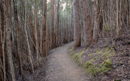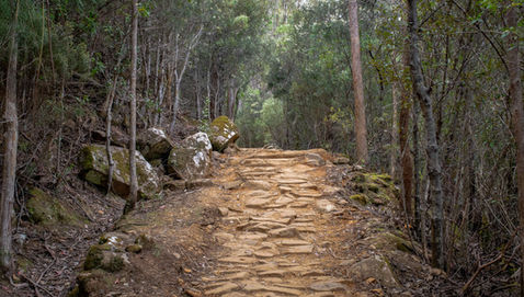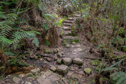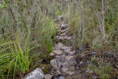 Starting on the Pinnacle Track you are thrown into the climbing straight away as the track makes its way through thick tunnels of vegetation up towards the summit. The ascent is not super steep but it's long and enough to get your legs burning, taking your breath away every now and then (much like the views a bit later on). Some beautiful stone stairs help your rhythm and a good collection of wildflowers in the scrub helps create an excuse to stop (not that you should need one to look at pretty flowers). The tunnels were doing a great job of blocking out the sunlight, along with the intermittent cloud cover, so this stretch was looking very photogenic and the details of the stone and old tree trunks weren't washed out. Breaks in the scrub provide a glimpse of the epic city views that become the norm further on and serve to build the excitement. A more sombre scene appears when you come across a small plaque marking the spot where a hiker had died competing in the "Go As You Please" race to the summit in 1903.