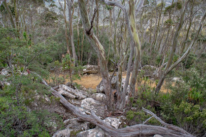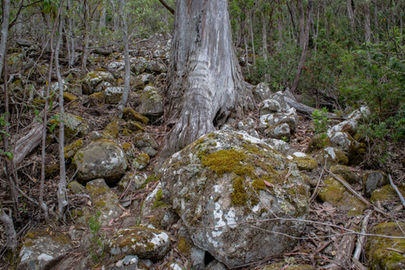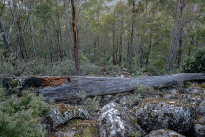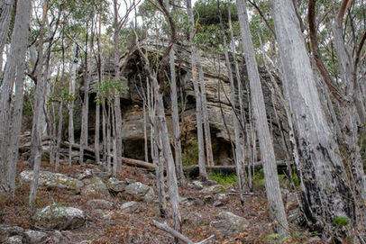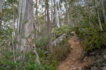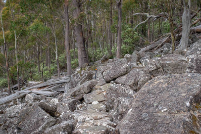 This is the beginning of a long descent from the peak of 1019m down towards the lowest point of the circuit at 626m and it is a very rocky affair. Skirting the edge of a scree field, this is a bit of preview to what is to come as you arrive at the intersection with the Hunters Track. Take the right hand turn and start following the Hunters Track as it heads back towards The Spring. Walking through some thick eucalypts, this was far from uneventful single track and soon it livened up a bit with a bit of rock hopping over the first big scree field. Orange markers guide your way and I had good fun bouncing from rock to rock as I had done at Toolbrunup Peak (although this was much flatter). Stopping occasionally to look back up the side of mountain and photograph the grey clouds that had rolled in over the summit, this hike was taking longer than I had planned but I wasn't complaining with scenes like this. The scree fields go on for a while, sometimes containing larger boulders that require a bit more effort but nothing that someone with a bit of confidence on their feet couldn't handle quite easily. As you head back into the forest once more, you walk under a rock formation up the hill that would be fun to explore but the track doesn't take you near it.