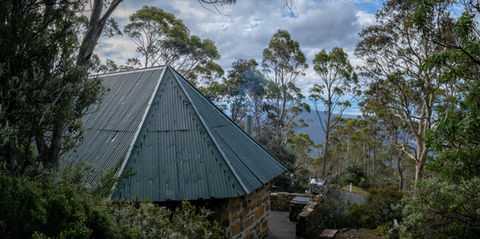 Heading back into the thicker vegetation revealed a small stream cutting its way through the rock and a bit further up a familiar smell peaked my interest. A sweet smoky aroma lingered on the afternoon air and I had a fleeting thought that they were doing prescribed burns (I am from WA). I rounded a corner and caught sight of The Chalet, an old hut that is now just an emergency shelter or a place to have a picnic. With views looking out over the Derwent River Valley, this is quite a cool little place on the edge of Pinnacle Drive and someone had left a small fire going in the fireplace. I wandered down expecting to find a group of people enjoying the warmth of the fireplace but the place was empty. Capturing some photos of this scene that could have been from 100 years ago (minus the green table), I had a quick look at the GPS and with this marking the end of the Organ Pipes Track I still had 5km to go. Hoping it would be more than just an uneventful single track, I really should have had more faith in Tasmanian hikes. Heading onto Pinnacle Drive and locating the track on the other side, I headed down the rocky path and onto the second part of the hike.