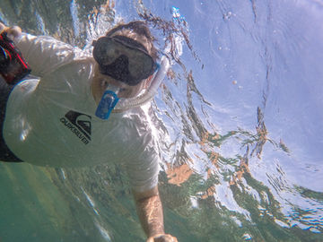 Not wanting to get too far away from everyone, I stuck to the area just south of the first island and waited for everyone to join me. The currents were strong during our visit and care had to be taken when near an exposed bit of the reef but it was great fun to ride the current, especially when the Bream were doing the same thing and you could follow them with ease. Everyone was soon together and Aron wanted a group circle selfie from below but I don't think the lens was quite wide enough to get everyone in. We all parted and I stayed with Caris for a little while as I didn't think she would be too keen on the further out sections of reef (she loves sharks but doesn't like the idea of being chomped by one). We continued to spot different types of fish and eventually we were separated again. The current took me further out towards the second island and I discovered some really cool sections with deeper channels. Not wanting to go too far away from the others (diver safety is crucial), I only spent a little while here but wish I had more time to venture out further. Everyone was slowly making their way in so I decided it was best to join them. Exploring the area around the Turn Island again, this was one of the more pleasant snorkels I've had in a while. The water from far from crowded (anyone who's visited Omeo on the weekend knows what crowded is), visibility was good and there were plenty of fish hanging about. Add in the whole squad being there and it was great fun.