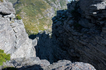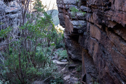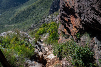 Looking down into the valley was awe-inspiring and again, it was quite obvious that was not the way as it leads all the way down to near the base of First Arrow/Isongerup. Instead you turn to the north-east and follow what looks like a gully as it heads downhill on a similar gradient to what you've just done. It's slippery in the sections without rocky footholds so care is needed and the elevation chart on the map above is nowhere near detailed enough to show what it's actually like. Continuing to descend, it feels like you've gone too far down but the trail eventually turns to the north and then west as you make your way around the edge of the rocky spire. You do have to climb back up and I went ahead here as I was keen to see what the views were like at the top of the climb. Reaching a collection of rocks, this was a good place to stop for a rest so I waited for Lou and Bronwyn to catch up. We all enjoyed a break before the final technical section of the day and the end of the Arrows. We missed the turn that heads north and descends down another tricky section and instead headed along the flat-ish path that takes you to the edge of a tall spire that provides views looking down towards She-Oak Col but no access. Doubling back we found the route and clambered down the last of the steep drops before marching on towards one of the more popular places to camp along the SRW.