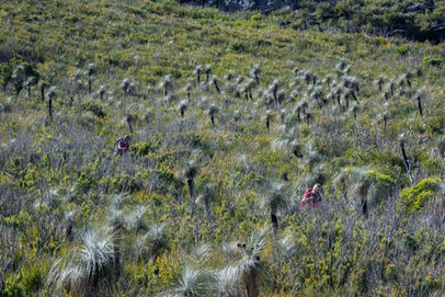 The turn is very obvious with one of the few yellow markers you'll see pointing you to the left along an obvious walking pad. Bronwyn regaled us with tales of tricky Sword Grass and mud through this next section but the first part rounding the edge of the peak was really pleasant. The views were spectacular and it finally felt like we were on the proper ridge walk. On the south side of Pyungoorup is a really cool area full of grasses, ferns and the rocky cliff face leading up towards the summit. We missed the track leading down from the cliff edge and eventually came to an obvious dead end but given the stunning views on offer, it wasn't a bad detour. We backtracked maybe 50m and found the track leading down towards the infamous Sword Grass. Trying to follow what looked like a trail was difficult given how thick the vegetation is and eventually I reached a point where I decided to head straight up the hill to get us back on track. Lou and Bronwyn had fallen over several times trying to navigate through the vegetation and after one last struggle they joined me against the cliff where a small cave is located. Although we were well behind our planned schedule of reaching at least the Third Arrow camping cave, the saddle before Bakers Knob was now a more realistic target for the evening. The going was still slow along here as the rocky trail soon ended and we were back in the Sword Grass.