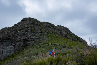 While Bronwyn and I were waiting, a trail runner passed us on his way to the summit of Ellen Peak and back. We watched him run into the distance and also kept an eye on the dark clouds gathering behind Ellen Peak. Lou popped up from the climb and as she caught her breath, we fished out our rain gear as it had started to drizzle. With just cloudy weather forecast, this was a reminder that the weather can be unpredictable up here. Moving on, we had a small descent towards the saddle and then another steep climb up to the base of Ellen Peak. This is where the almost manicured trail disappeared and was replaced by shoulder high regrowth but it wasn't too hard to navigate between rocky sections that were trail like. As we approached the ascent, the path became clear again and we just had to worry about putting one foot in front of the other. For about 700m the gradient averages 35% so with a fully loaded pack it wasn't a fun ascent and we slowed up quite a bit here. This allowed me to stop and appreciate the landscape a little bit more as we had decided to stick together as a group.