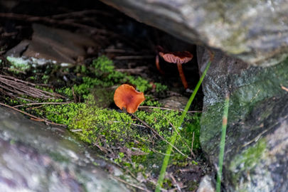 Lou had some doubt over whether she would be able to finish but Bronwyn and I kept reminding her that this was the biggest climb and things would get slightly easier once we reached the top. With the sunshine now out, we steadily made our way to the hunk of rock that is Ellen Peak and Bronwyn had planned for us to take an easier route around the northern edge of the base rather than follow the official route over the top. Reaching the junction, we turned right and headed off to follow a trail that hugs the edge of the gigantic rock face. Trying to keep as close to the edge as possible, the path was obvious in most places and this area seems to have recovered well from the burns or were a little protected. It dips down before climbing back up and the She-Oaks through here were really enjoyable. As we started to climb back up, I spotted some fungi in some of the damp places and this had me excited that we were getting to that time of the year again. It's another steep climb of 100m vertically to get onto the next saddle but the views looking back at Ellen Peak make it all worthwhile. Ahead of us was an open saddle section between Ellen Peak and the start of Pyungoorup Peak but knowing the trail heads to the south of Pyungoorup, we were on the lookout for the turn.