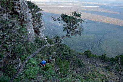 From here the views are focussed to the north and the vast farming lands that extend beyond the park. It's sad that the Stirling Range National Park is limited to the mountain peaks and a small section of flat land as I often wonder when I'm visiting here what it all looked like before the mass clearing occurred. We had a light-hearted moment as we made our way along the exposed top of First Arrow with Lou getting the cord of her hat stuck on a branch. Bronwyn came to the rescue as I took helpful photos before we got going again. From the top of First Arrow you can see the start of the climb leading up to three peaks of Isongerup but it looks a long way down to reach the She Oak Col at the base of the saddle. From here there is only one way to go and that is straight down arguably the sketchiest section of the whole Stirling Ridge Walk. The photos sort of show the steep drops that you must negotiate as you clamber down the rocky ledges and Lou provided some great action shots once I'd successfully negotiated each section. Some people advise to bring rope for this section so you can lower packs down the narrow and steep parts but only once did one of us remove our pack to safely get down a passage. I love this sort of scrambling so was in my element as we descended the first section down towards the edge of the northern most spire.