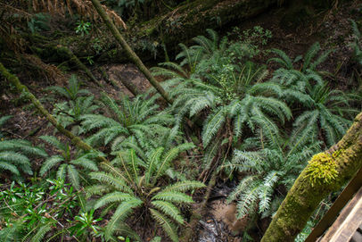 Before you get to that point there is a wishing tree below where you can flick coins onto. The sawn off tree is a short distance below the platform but it's still a challenge to land a coin on the surface available. Some people had managed this feat but if you miss you can consolidate yourself that the coins that fall to the floor go to charity. The real delight though is up a little further with the cantilevered lookout. Luckily we had good weather when we visited with minimal wind and a good sprinkling of clouds in the sky. We let Elizabeth (aka Lizard Breath) and Kellie go first and after they had enjoyed it we ventured out to take our photos and soak in the views. I have to say that the experience was everything I had hoped it would be after reading about it before coming to Tasmania. It's one view I'm not going to forget any time soon and was a different experience to be thrust out from the forest and over the river. With a few people waiting their turn we headed back and finished the rest of the Airwalk before locating the signs for the Swinging Bridges Loop.