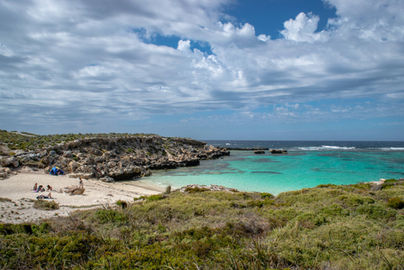 Apart from being super pretty, Parker Point is also home to a snorkelling trail that I was keen to explore. Unfortunately the winds were a bit strong and we decided that there would be plenty of opportunity to snorkel on one of the northern beaches. Instead we stood out on the wooden platform and admired the stunning landscape. With a boat anchored in the turquoise waters I took plenty of photos of the idyllic scene before we headed back to the trail and on to the other side of the point. The western side of the point is Little Salmon Bay, another fantastic little beach that also has its own snorkelling trail. When we arrived there was already a crowd of people there enjoying the sunshine so we left them to it and made our way back towards Parker Point Rd. The road sections of this trail don't detract from the walk at all as they are usually accompanied by stunning views and this tiny section was no different. Overlooking Salmon Bay, you had the ocean to one side, the pristine beaches of Salmon Bay on the other and the Wadjemup Lighthouse in the distance. A bus snuck up behind us and gave a friendly toot for us to move off the road so we happily obliged.